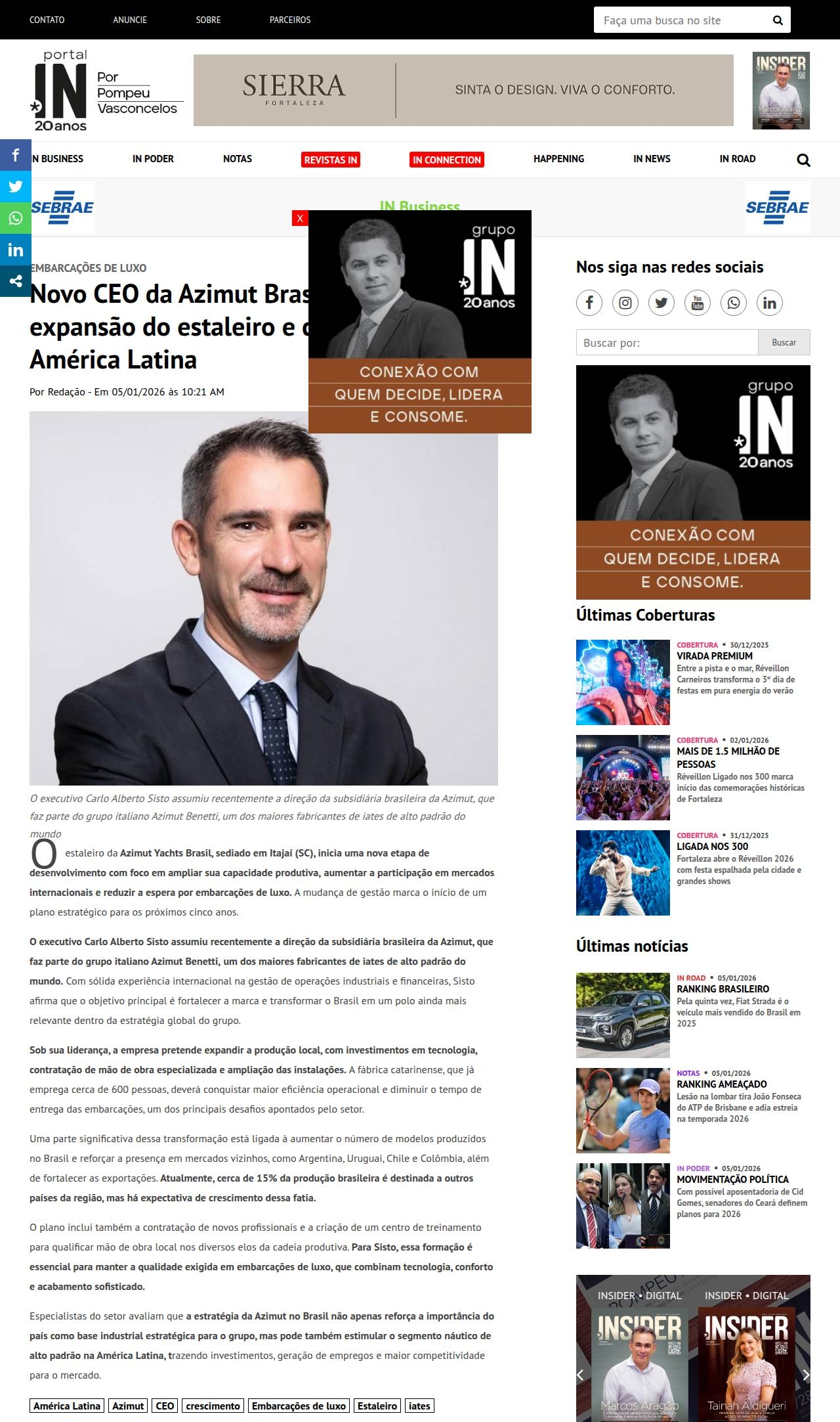 Novo CEO da Azimut Brasil aposta em expansão do estaleiro e crescimento na América Latina - Portal IN - Pompeu Vasconcelos - Balada IN